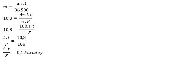 Berapa Faraday arus listrik yang diperlukan untuk mengendapkan 10,8 gram logam perak (Ar Ag = 108) yang dialirkan ke dalam larutan AgNO3?