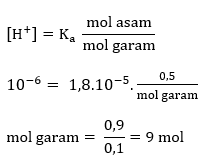 Jadi untuk memperoleh larutan penyangga dengan pH = 6, maka harus dilarutkan natrium asetat sebanyak 738 gram.