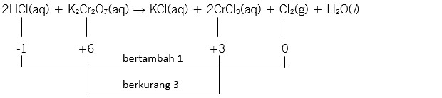 Cl pada ruas kiri (HCl) = -1 dan pada ruas kanan (Cl2) = 0, sedangkan Cl dari KCl dan CrCl3 tidak mengalami perubahan bilangan oksidasi, yaitu -1.